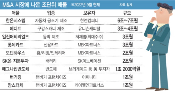 이달 현재 M&A 시장에 나와 있는 조 단위 매물(경영권 인수·지분투자 포함)은 총 9곳에 이른다. 예년과 비교해 대형 매물 출현이 겹친 상황에서 매각 측으로서는 열기 조성을 반길 수밖에 없다.
