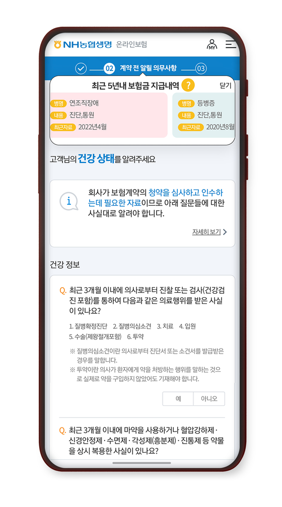 청약 과정 중 '보험금 지급 이력 사전 알림 서비스' 이용에 동의한 고객에 한해 과거 5년간 국내 보험사 보험금 지급 이력이 안내된다. ▶주요 질환에 대한 병명 ▶치료 내용 ▶치료 시기 등을 한 화면에서 간편하게 확인할 수 있다. 현재 지급금액, 입원일 등을 기준으로 최대 6개까지 보여준다.