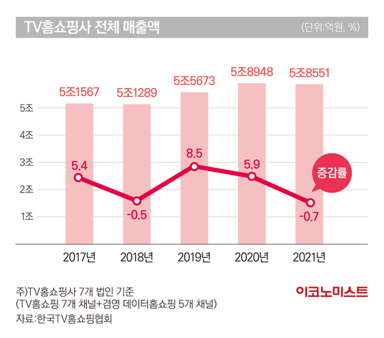 TV홈쇼핑사들의 전체 매출액 역시 줄어들고 있다. 실제 TV홈쇼핑협회에 따르면 지난해 TV홈쇼핑사 전체 매출액은 5조8551억원으로 전년보다 –0.7% 감소했다. TV홈쇼핑사들의 매출액은 2017년 5조1567억원에서 2018년 5조1289억원으로 감소했지만 2019년 5조5673억원, 2020년 5조8948억원까지 성장한 모습을 보였다. 다만 지난해에는 다시 감소세로 돌아선 모습이다.