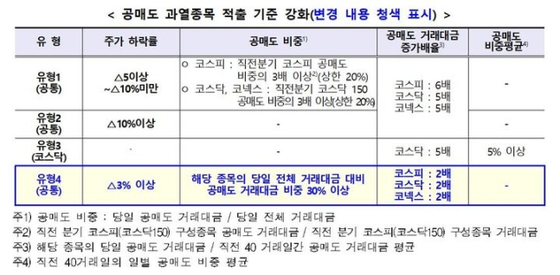 당초 공매도 과열종목 적출 기준은 3개였다. 발표된 강화 제도에 따르면 유가증권·코스닥·코넥스 구분 없이 ▶당일 전체 거래대금 대비 공매도 거래대금 비중 30% 이상 ▶주가 하락률 3% 이상 ▶공매도 거래대금 증가배율 2배 이상일 때 공매도 과열종목으로 지정된다.