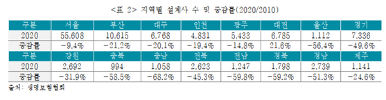 최근 10년간 생명보험사 전속 설계사 수는 수도권과 대도시가 82.7%, 84.3% 수준으로 감소했지만 지방은 49.1%로 급감했다. 연구원은 “지방은 상대적으로 열악한 교통 사정과 인구의 분산으로 설계사 영업활동이 매우 제한적일 수밖에 없다”며 “이에 더해 지방의 전속설계사 수는 갈수록 적어져 지방 거주민들의 상품 선택권은 축소되는 추세”라고 밝혔다.