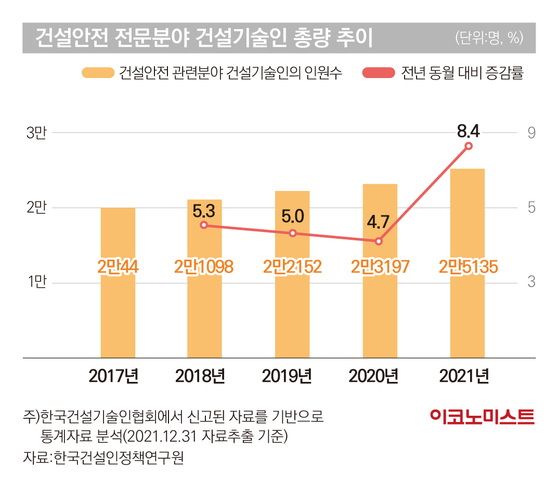 이에 안전관리 직무 분야의 건설기술인은 매년 증가하는 추세다. 한국건설인정책연구원의 건설기술인 동향 브리핑 자료에 따르면 2021년 12월 안전관리 직무 분야 건설기술인은 3만 9062명으로 전년 동월 대비 약 5.7%(2110명) 증가했다.