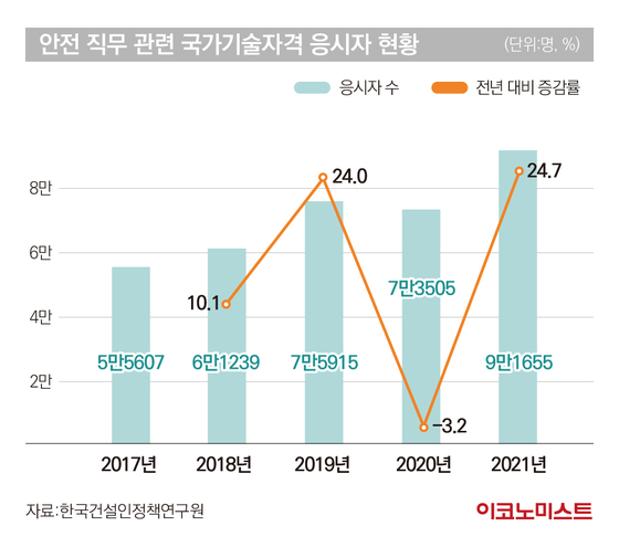 안전 직무 관련 국가기술자격 취득 응시자도 급증했다. 지난해 안전 직무 관련 자격을 취득하려는 응시자 수는 9만 1655명이다. 2020년 대비 24.7%, 2017년 응시자(5만 5607명) 대비 약 64.8% 증가한 규모다.