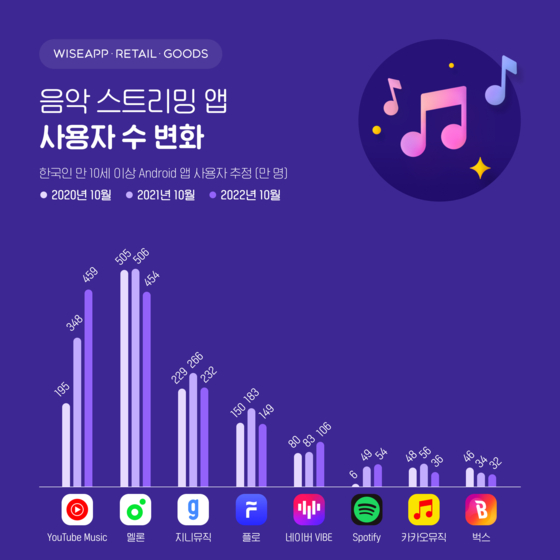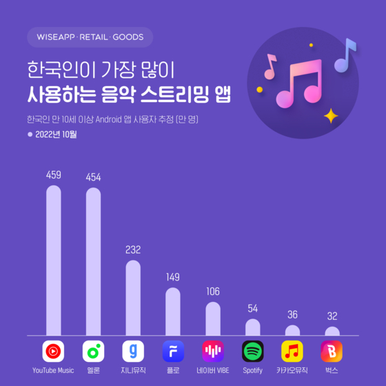 그 뒤로는 멜론 454만명, 지니뮤직 232만명, 플로 149만명, 네이버 바이브 106만명, 스포티파이 54만명, 카카오뮤직 36만명, 벅스 32만명 순이었다.