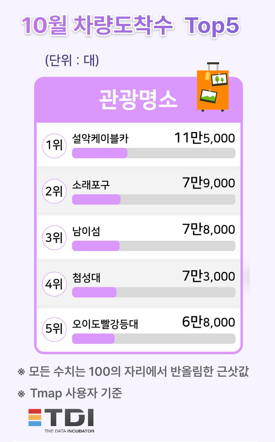 이들 5곳의 9월 대비 10월 차량도착수는 크게 증가했다. 증감률이 설악케이블카가 206.4%에 이를 정도다. 이어 소래포구 7.9%, 남이섬 153.5%, 첨성대 150.5%, 오이도빨간등대 5.6%를 기록했다.