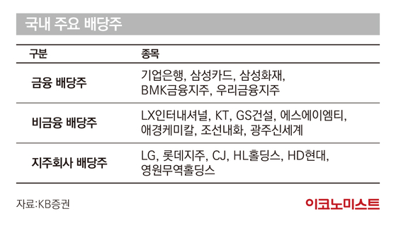 대표적인 국내 배당주로는 기업은행‧삼성카드‧우리금융지주 등 금융주를 비롯해 LX인터내셔널‧KT‧GS건설‧애경케미칼 등이 꼽힌다. LG‧롯데지주‧CJ‧HD현대 등 지주회사들도 고배당을 기대할 수 있는 종목들이다.