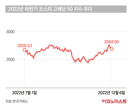 8일 한국거래소에 따르면 코스피 고배당 50 지수는 지난 1일 전 거래일 대비 1.47% 상승한 2765.14에 마감했다. 지난 10월 26일 2438.12까지 떨어졌던 코스피 고배당 50 지수는 약 한 달 만에 13.4%나 치솟았다. 같은 기간 코스피 지수가 10.2% 올랐다는 점을 감안하면 연말을 앞두고 배당주들의 상승세가 두드러졌다는 얘기다.