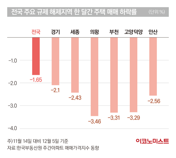 조정대상지역과 투기과열지구에서 풀린 의왕시가 규제지역 해제 직후 동일기간(11월14일 대비 12월5일) 아파트 매맷값이 3.46% 떨어진 것을 비롯해 고양덕양(-3.29%), 시흥(-2.31%), 부천(-3.31%), 안산(-2.56%) 등도 큰 매맷값 하락률을 기록했다.