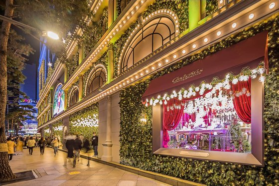 롯데백화점 본점 앞 모습. [사진 롯데백화점] 백화점 업계의 크리스마스 야경 전쟁도 치열하다. 롯데백화점 소공동 본점 크리스마스 장식의 핵심은 서울 중구 소공동 본점 외관에 길이 100m, 3층 높이의 대형 파사드를 구축한 것이다. 구조물 전체를 트리와 조명으로 꾸미고 쇼윈도를 설치했다. 가족과 연인, 친구 단위로 모두가 즐길 수 있는 공간을 만들었다고 전했다.