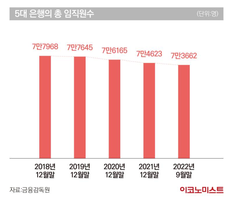 금융감독원에 따르면 5대 은행의 총 임직원 수는 ▶2018년 12월 말 7만7968명 ▶2019년 12월 말 7만7645명 ▶2020년 12월 말 7만6165명 ▶2021년 12월 말 7만4623명 ▶2022년 9월 말 7만3662명 등을 기록했다. 2021년에는 5대 은행의 인력이 총 1542명이 감소하며 2019년 이후 가장 많은 수가 은행을 떠난 것으로 기록됐다.