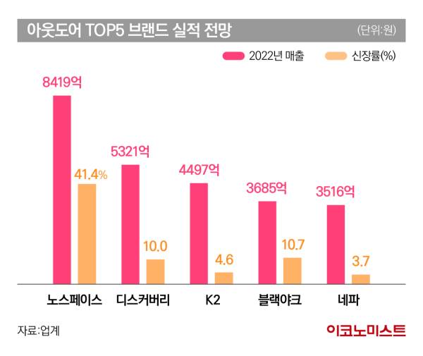 패션업계에 따르면 지난해 ‘빅5’ 아웃도어 업체 가운데 노스페이스는 독보적 1위 매출을 기록한 것으로 전망된다. 지난해 3분기 공시한 실적에서도 매출과 영업이익이 전년 동기 대비 약 45.6%, 61.2% 증가하면서 역대급 실적을 예고한 바 있다.