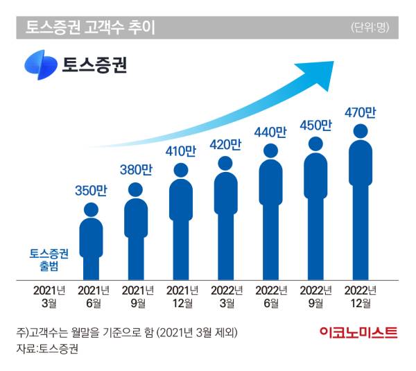 덕분에 해외주식 서비스는 토스증권의 실적 효자로 자리매김했다. 지난해 토스증권 해외주식 서비스 매출은 전체의 30% 수준을 기록했다. 2022년 1분기만 해도 37억원에 불과했지만 3분기 130억원으로 세 배 이상 급증했다. 같은 기간 해외주식 거래대금도 6조2000억원에서 13조5000억원으로 뛰었다.