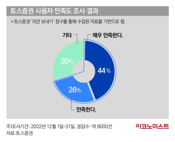 토스증권이 지난 12월 한 달간 ‘의견 보내기’ 창구를 통해 고객 의견을 조사한 결과, 전체 의견 8000여 건 중 70%가 토스증권 서비스에 만족하는 것으로 나타났다. 쉽고 직관적인 서비스에 만족한다는 의견이 많았다. 사용자들은 “주식 거래 시 알아야 할 지식을 이해하기 쉽게 설명해 준다”. “UI가 직관적이어서 타 증권사 앱에 비해 빠르고 쉽게 사용할 수 있다”, “매수와 매도가 편하고 가볍게 접근할 수 있어 좋다”고 평가했다.