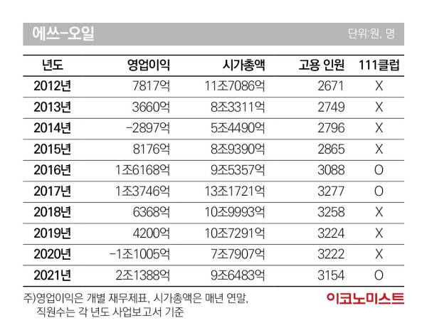 실제로 에쓰오일은 최근 10년 중 2014년과 2020년 각각 2897억, 1조1005억 영업손실을 기록기록하던 상황에서 대규모 투자를 집행했다. 특히 2014년 당시 회사는 적자 상황에서도 1400억원을 투자해 ‘슈퍼(SUPER: S-Oil Upgrading Program of Existing Refinery) 프로젝트’의 일환인 생산설비 개선작업을 밀어붙였다. 그 결과 에쓰오일은 윤활기유 생산량을 늘려 2016년 실적을 큰 폭으로 끌어올리면서 111클럽에 처음으로 이름을 올렸다.