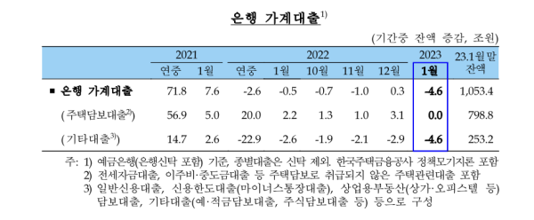 윤옥자 한국은행 금융시장국 시장총괄팀 차장은 “가계대출 감소폭은 한국은행 속보치가 작성된 이래 가장 큰 감소 규모”라며 “기타대출 감소폭은 역대 두번째 규모이며, 연말 연초 가계의 상여금 유입 등 대출의 상환압력이 높아지는 계절적 요인이 작용했다”고 설명했다.