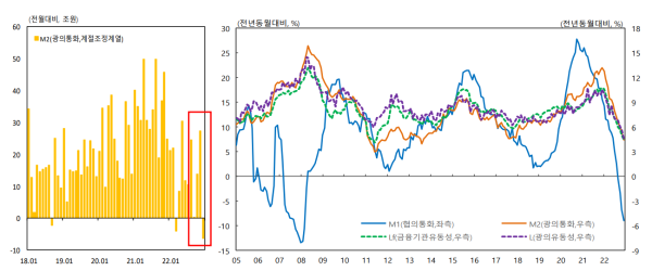 M1은 은행의 요구불예금, 수시입출금식 저축성예금 등 언제든 현금화가 가능해 높은 수익률을 좇아 움직이기 쉬운 자금을 의미한다.