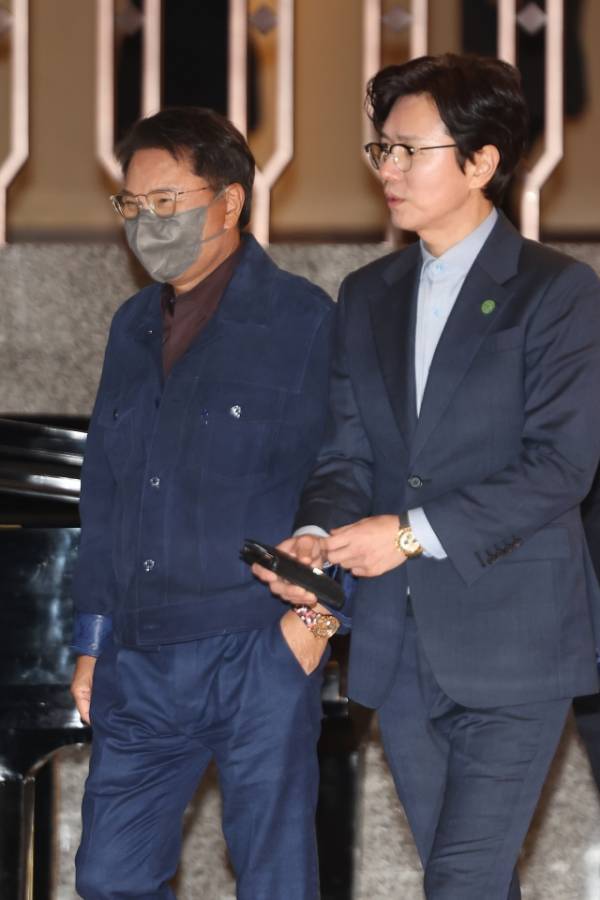 이수만, 김민종 부축받으며 첫 공식석상…SM 질문엔 ‘침묵’