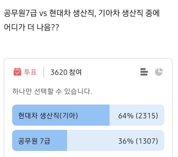 직장인 커뮤니티에서 실시된 한 온라인 투표에서는 ‘7급 공무원보다도 현대차 생산직이 낫다’는 의견이 64%에 달하기도 했다.
