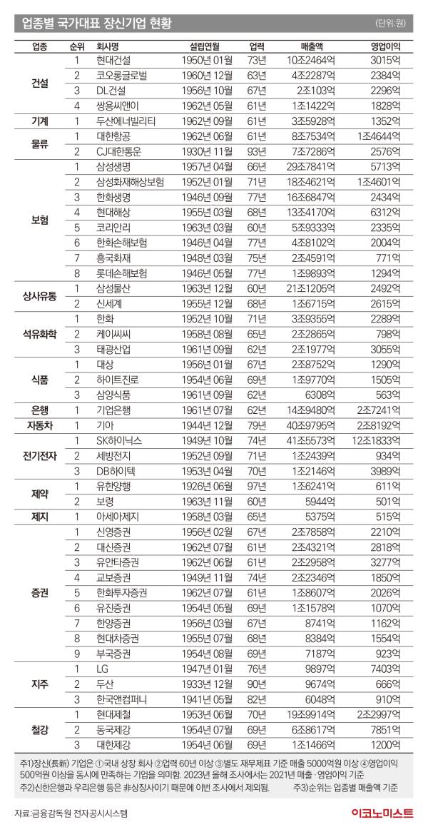 국내 2540개 상장사 가운데 2023년 기준 업력(業歷)이 60년을 넘는 곳은 177곳이다. 이 가운데 실적 상위 10% 수준으로 평가되는 연매출 5000억원, 영업이익 500억원 이상인 기업은 46곳으로 집계됐다.