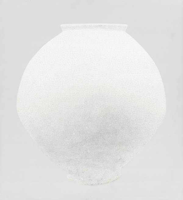 최영욱은 오로지 달항아리만 그립니다. 2005년부터 시작된 그의 달항아리는 젯소와 백색 돌가루를 섞어 칠해가며 완성됩니다. 칠이 마르면 다시 사포로 다듬고 또 다시 덧칠하기를 반복하는 과정을 거칩니다. 그렇게 쌓아 올린 안료를 매끈하게 다듬고 다시 칠하기를 수행하듯 거듭하면 비로소 달항아리가 자태를 드러냅니다.