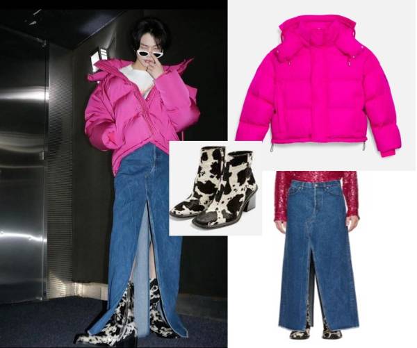 치마와 함께 착용한 젖소 모양의 프린트 신발 역시 드리스 반 노튼의 ‘블랙 앤 화이트 카우 프린트 집업 부츠’ 제품이다. 이 제품은 공식 출고가 1340달러(한화 약 177만원)로 현재는 951달러(한화 약 125만원)에 판매되고 있다.
