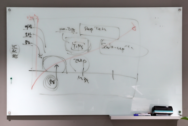 그의 사무실도 그를 닮았다. 업계에서 인정받고 있는 심사역 1세대의 사무실이라고 하기에는 단출하다. 3~4평 정도 되는 조그마한 사무실에는 회의 탁자와 일하는 책상 그리고 캐비닛 그리고 벽에는 뭔가 적혀 있는 화이트보드와 조그마한 그림이 걸려 있다. 그가 업무를 보는 책상은 모니터와 노트북같이 꼭 있어야만 하는 것만 있다.