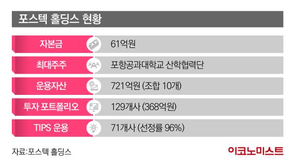 2012년 6월 설립된 포스텍 홀딩스는 초기 스타트업 투자사, 흔히 말하는 액셀러레이터다. 설립 후 4년 만에 중소벤처기업부 ‘팁스(TIPS) 프로그램’ 운영사로 선정되면서 업계에 이름을 알리기 시작했다. ‘민간투자주도형 기술창업지원(TIPS)’ 프로그램의 가장 큰 특징은 민간투자사의 투자금에 정부 모태펀드가 매칭된다는 것이다. 초기 스타트업엔 팁스에 선정되느냐 여부가 후속 투자 유치에 큰 영향을 끼친다. 액셀러레이터 또한 팁스 운영사로 선정되느냐 여부가 투자사로 성장을 하는 데 필수적인 조건으로 꼽힌다. 포스텍 홀딩스는 4월 현재 129곳의 스타트업에 투자를 했고, 721억원의 투자금을 운용하는 투자사로 성장했다.