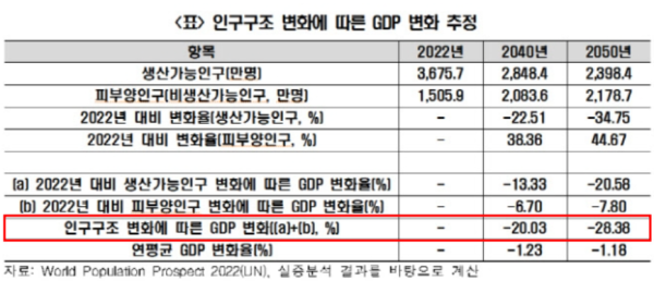 이를 바탕으로 다른 요인이 일정하다고 가정했을 때 한국의 인구구조 변화로 2040년 GDP는 2022년 대비 20.03%, 2050년은 28.38% 감소할 것으로 예상된다.