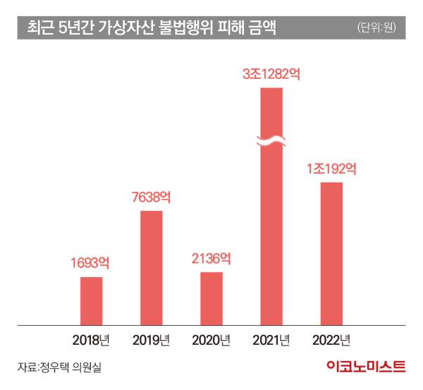 국회 행정안전위원회 소속 정우택 국민의힘 의원이 경찰청으로부터 제출받은 자료에 따르면 2018년부터 지난해까지 5년간 가상자산 불법행위 피해 금액은 5조2941억원으로 집계됐다.