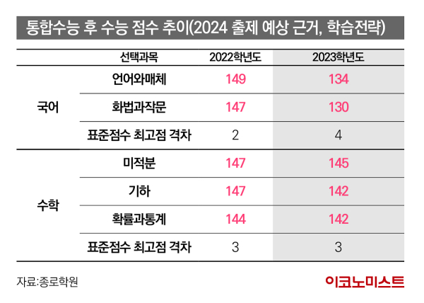 특히 지난해 2023학년도 수능에서는 국어에서 1문제도 안 틀릴 경우 표준점수 최고점이 134점, 수학에서 1문제도 안 틀릴 경우 145점이 나와 국어에서 만점을 맞은 학생이더라도 수학을 못 봤을 경우 도저히 극복할 수 없는 상황이 됐다. 사실상 지난해 수능은 영어가 절대평가인 상황에서 수학 1과목으로 평가를 받았다는 인식을 수험생 입장에서는 할 수 있다.