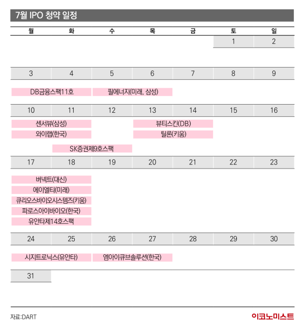 1일 금융감독원 전자공시시스템에 따르면 7월엔 12개 기업(스팩 제외)의 청약 일정이 대기 중이다. 앞서 청약을 진행한 기업들이 4월 4곳, 5월 7곳, 6월 6곳 등 한자릿수에 불과했던 점을 고려하면 7월엔 말그대로 IPO 슈퍼위크가 열리는 셈이다.