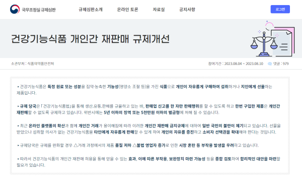 9일 관련 업계에 따르면 국무조정실은 ‘건강기능식품의 개인 간 재판매 규제개선’을 주제로 일반 시민을 대상으로 한 온라인 토론회를 진행하고 있다. 지난 4일 시작한 이 토론회에는 이날 오후 7시를 기준으로 970여 명이 개인의 건강기능식품 재판매를 허용할지에 대한 의견을 등록했다. 앞서 국무조정실은 지난달 27일 이와 관련한 예비회의도 연 바 있다.