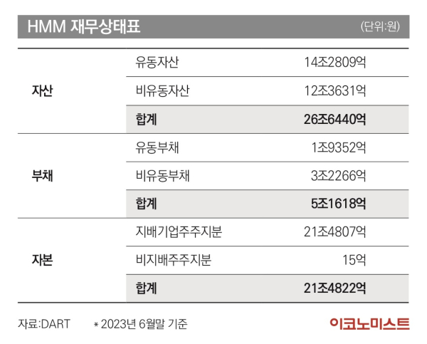 15일 금융감독원에 따르면 HMM의 올해 6월말 기준 유동자산은 14조2809억원에 달한다. 당장 뽑아 쓸 수 있는 현금 및 현금성자산(1조6977억원)을 비롯해 만기 1년 미만의 기타유동금융자산(10조6085억원), 주식 등 당기손익자산(2334억원)도 상당하다. 유동성파생상품자산(1026억원), 기타유동자산(1339억원) 등도 언제든 현금으로 전환할 수 있다.