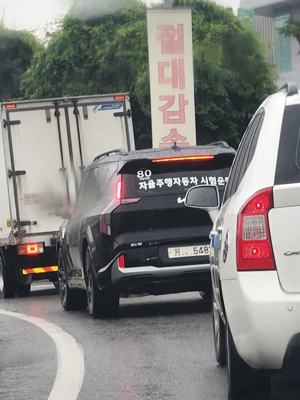 고속도로에서 시험운행 중인 기아 EV9 자율주행자동차. 기아는 연내 최고 80km/h로 주행 가능한 고속도로 주행보조(HDP)를 탑재한 EV9을 선보일 계획이다. [사진 온라인 커뮤니티 캡처]