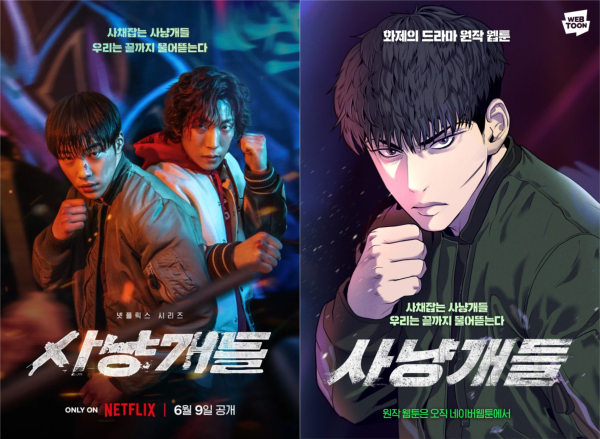 웹툰은 긴 호흡으로 탄탄한 세계관·캐릭터를 구축할 수 있다. 이는 2차 창작물의 몰입도를 높일 수 있는 요인으로 고스란히 작용한다. 네이버웹툰 플랫폼을 타고 원천 IP가 미국·유럽·일본·동남아 등으로 뻗어나가고 있어 ‘글로벌 흥행’을 노릴 수 있다는 점도 2차 창작물의 흥행을 기대케 하는 요소로 꼽힌다. 넷플릭스 드라마 ‘사냥개들’ 포스터(왼쪽)와 네이버웹툰 ‘사냥개들’ 이미지. [제공 각 사] 네이버웹툰이 만든 ‘플러스 알파’는?