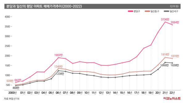 아파트 매매가격 통계가 본격 집계되기 시작한 2000년도 이후 분당과 일산의 집값 추이를 살펴봤다. 2000년 기준, 분당과 일산의 평당 아파트 가격은 154만원이나 차이가 났다. 일산이 분당의 3분의 2 수준이었다.