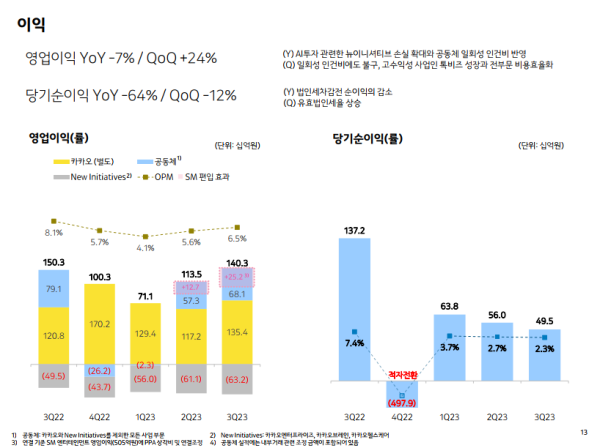 카카오의 수익성은 이로써 3분기 연속 뒷걸음질 쳤다. 올해 초부터 영업이익 규모가 지속해 줄어들고 있다. 구체적으로 올해 영업이익은 2022년과 비교해▲1분기 55% 감소 ▲2분기 34% 감소를 기록했다. 영업이익률도 2022년엔 ▲1분기 9.6% ▲2분기 9.4% ▲3분기 8.1% ▲4분기 5.7%를 기록했으나, 2023년엔 ▲1분기 4.1% ▲2분기 5.6% ▲3분기 6.5%로 집계되면서 전반적으로 낮게 나타났다. 올해 초부터 시작한 수익성 악화를 좀처럼 끊어내지 못하는 모습이다.