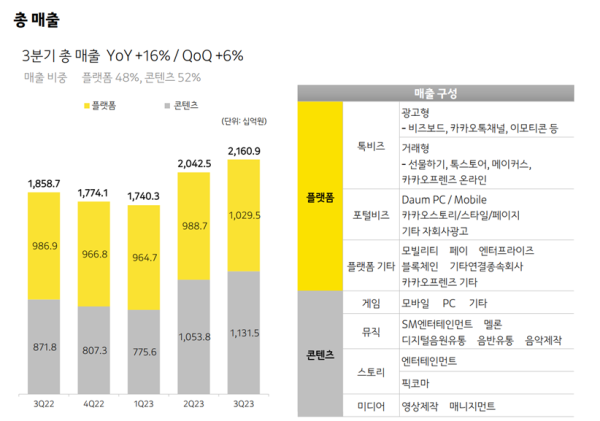 카카오는 자사 매출을 크게 ▲플랫폼 ▲콘텐츠로 구분해 발표하고 있다. 플랫폼은 다시 ▲톡비즈 ▲포털비즈 ▲기타로 구분된다. 콘텐츠엔 ▲게임 ▲뮤직 ▲스토리 ▲미디어 사업이 속한다.