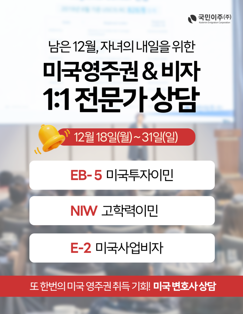 하반기부터 부쩍 늘어난 미국영주권 승인 소식에 따라 자녀를 위한 미국 영주권 상담과 신청이 잇따르며, 연말이 지나기 전에 집중 상담을 실시하는 것이다.