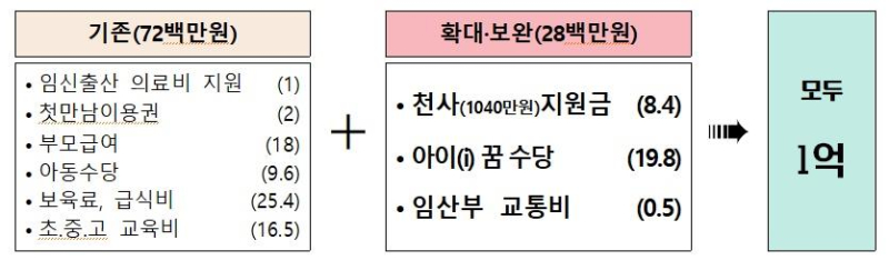 인천시는 임신출산 의료비 100만원, 첫만남 이용권 200만원, 부모급여 1800만원, 아동수당 960만원, 보육료와 급식비 2540만원, 초·중·고 교육비 1650만원 등 기존 지원금 약 7200만원을 유지하면서 추가로 약 2800만원을 지원할 계획이다.