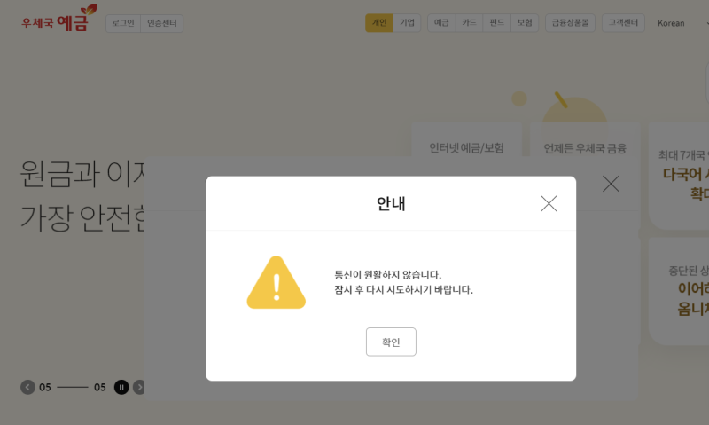 이날 오후 3시 30분 현재도 우체국 인터넷뱅킹 사이트 등에 접속이 원활하게 이뤄지지 않고 있는 상태다.