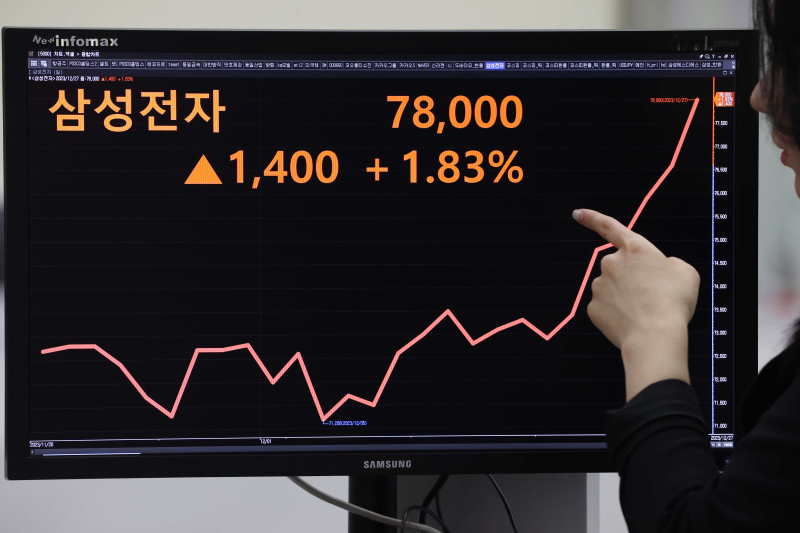 6일 한국거래소에 따르면 삼성전자는 전 거래일과 같은 7만6600원에 장을 마감했다. 지난해 1월2일 5만5500원까지 떨어졌던 주가는 12월 중순부터 상승 랠리를 이어가며 7만8500원까지 회복했다. 이달 3일에는 7만9600원에 거래를 마치며 ‘8만전자’ 코 앞까지 왔다. 당장 고대역폭메모리(HBM) 수요 증가 등 호재로 인해 새해 8만원대를 넘어 ‘10만전자’도 바라볼 수 있다는 기대감이 나오는 이유다.