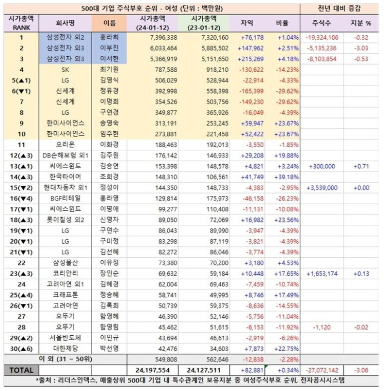 16일 기업분석연구소 리더스인덱스가 국내 500대 기업 오너 일가 소속으로 주식을 대량 보유한 여성 417명 중 상위 50명의 주식 가치 변화를 조사한 결과, 삼성가 세 모녀가 보유한 주식 시가총액은 지난 12일 종가 기준 24조1975억원으로 지난해 1월 12일(24조1275억원)보다 약 0.3% 증가했다.