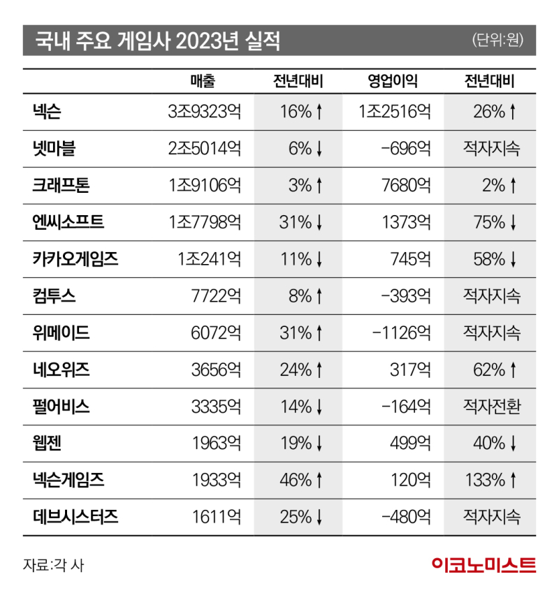 지난해 ‘P의 거짓’으로 흥행 돌풍을 일으켰던 네오위즈는 매출 3656억원, 영업이익 317억원을 기록했다. 이는 전년 대비 각각 24%, 62% 증가한 수치다. ‘블루 아카이브’ 일본 흥행에 성공한 넥슨게임즈도 지난해 매출 1933억원, 영업이익 120억원을 기록했다. 매출은 전년 대비 46% 늘었고, 영업이익은 133% 증가했다.