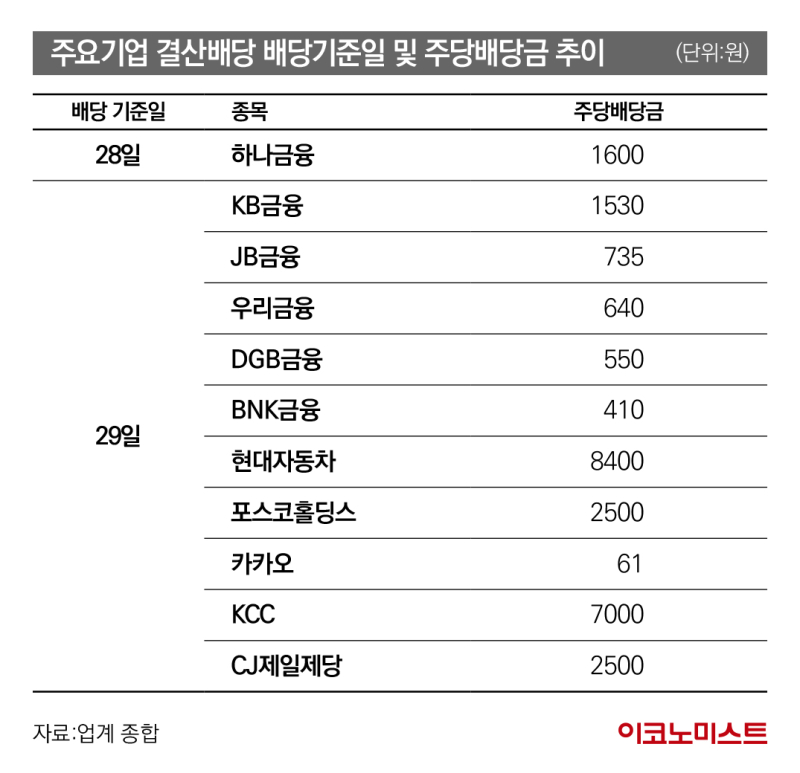 한국거래소에 따르면 이달 28일 하나금융을 시작으로 29일 KB금융·JB금융·우리금융·DGB금융지주 등 금융지주들의 결산 배당 기준일이 몰려 있다. 최근 역대 최대인 주당 8400원의 지난해 결산 배당을 결정한 현대차의 기준일도 29일로 정해졌고 현대자동차, 포스코홀딩스, 카카오, KCC, CJ제일제당 등의 기준일도 29일이다.