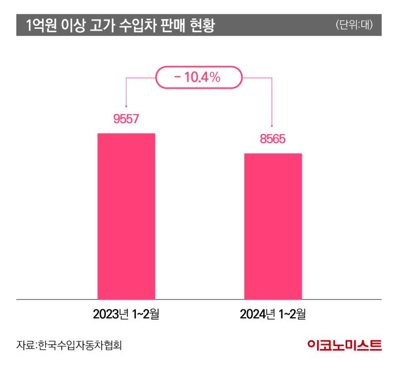 올해 들어 국내 럭셔리 수입차 수요가 급감하고 있다. 한국수입자동차협회(KAIDA)에 따르면 판매 가격이 1억원 이상인 수입 승용차의 올해 1~2월 누적 신규 등록 대수는 8565대로 집계됐다. 이는 전년 동기(9557대) 대비 10.4% 감소한 수치다.