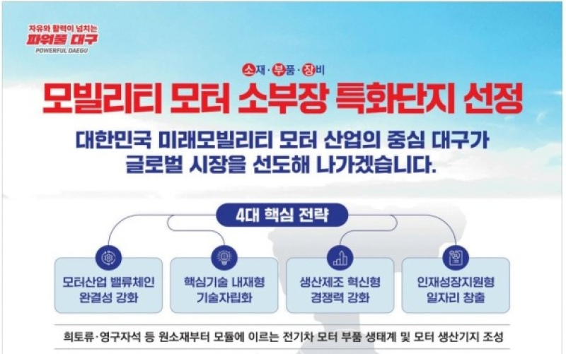 현재 전기차 시장의 급성장에 따라 핵심부품인 모터 수요가 폭발적으로 증가할 것으로 전망되는 가운데, 이번 소부장 특화단지 맞춤형 지원방안 확정으로 대구의 모빌리티 모터 소부장 특화단지 육성에 가속도가 붙을 것으로 기대된다.