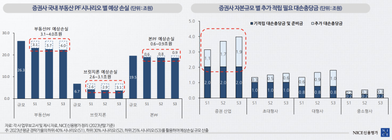 나이스신용평가(나신평)는 12일 ‘부동산PF 손실인식 현황과 추가 손실 전망’ 세미나를 열고 이 같은 내용을 발표 했다. 나신평에 따르면 국내 25개 증권사의 기적립 대손충당금·준비금 규모 2억원을 감안하면 부동산 경기 하강 시나리오에 따라 최소 1조1000억원에서 최대 1조9000억원의 추가손실이 발생할 수 있다.