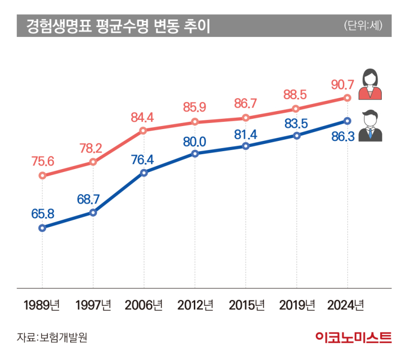 보험개발원이 올해 초 발표한 제10회 경험생명표에 따르면 평균수명은 남성 86.3세, 여성 90.7세로 5년 전(9회)보다 각각 2.8세, 2.2세 늘어났다. 여성 평균수명이 90세를 넘은 건 이번이 처음이다.