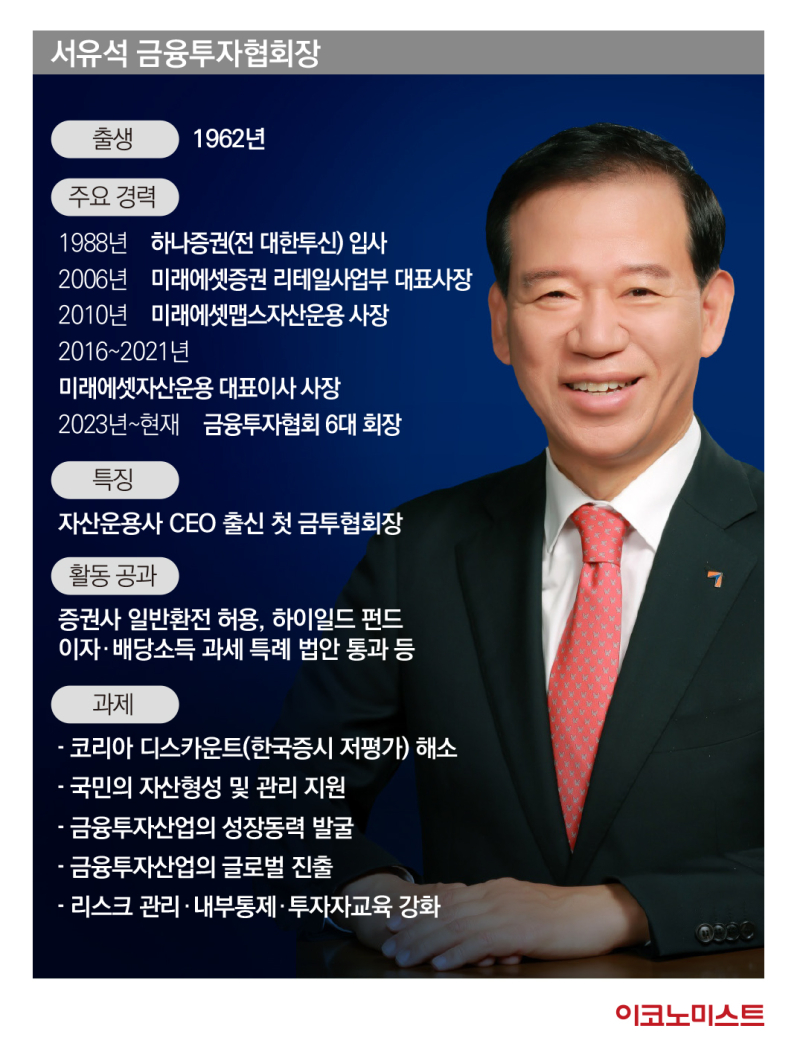 서 회장은 역대 금투협 회장 중 유일한 자산운용사 출신이다. 때문에 업계에서는 증권사 위주가 아닌 금융투자업계 전반의 입장을 고루 대변할 것이란 기대감이 높았다. 서 회장은 1962년생으로 배제고등학교를 나와 고려대학교에서 경제학을 전공하고 고려대학교 대학원에서 재무관리 석사학위를 받았다. 서 회장이 직장생활을 시작한 것은 1983년 대한투자신탁에서다. 그러다 2003년 미래에셋증권 마케팅본부장 상무로 자리를 옮겨 미래에셋증권 리테일사업부 대표, 퇴직연금추진부문 대표 등을 지냈다. 자산운용사 대표로 일한 것은 2010년부터다.